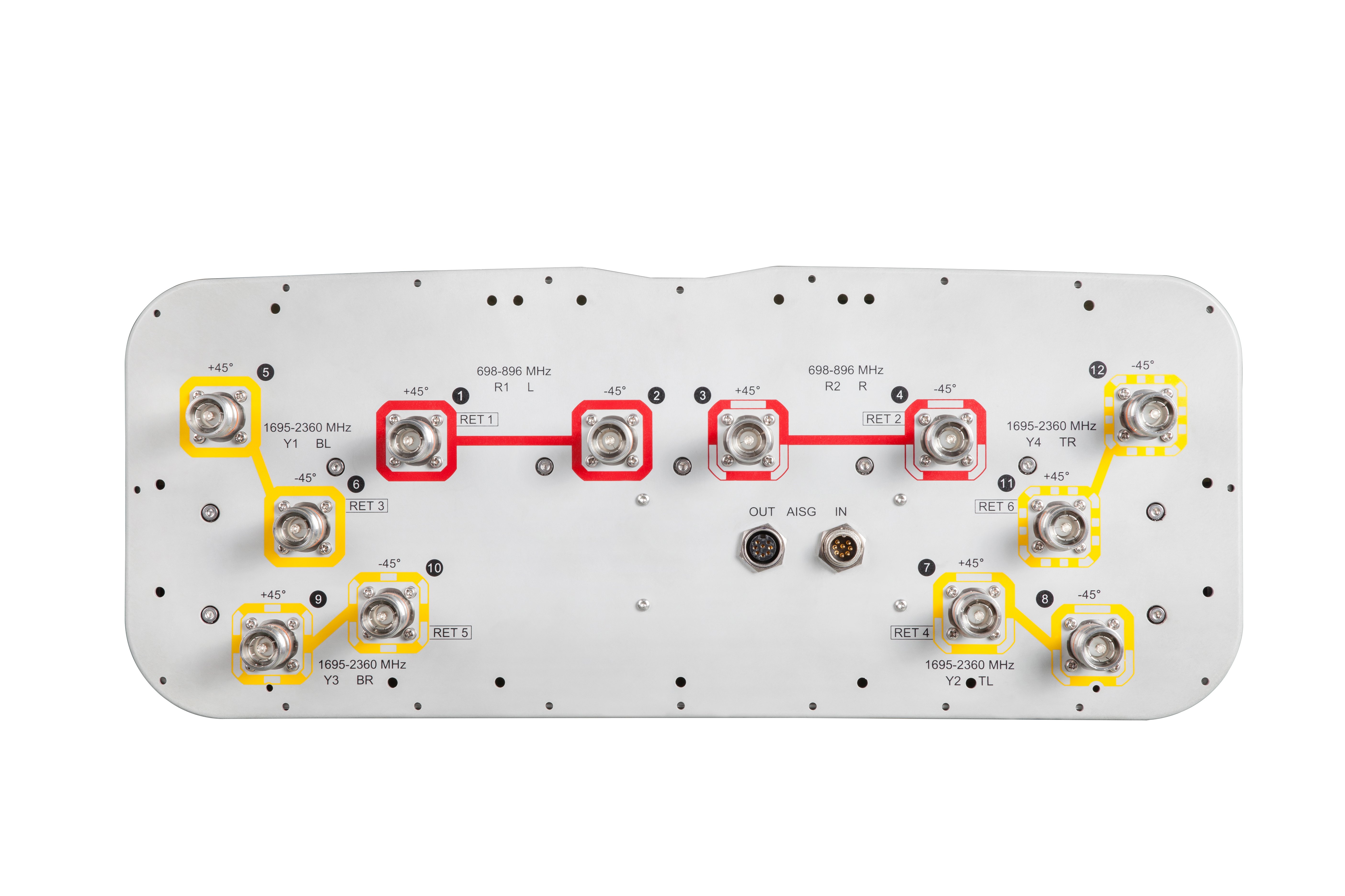 12-port sector antenna, 4x 698896 and 8x 16952360 MHz, 65° HPBW, 6x RET.